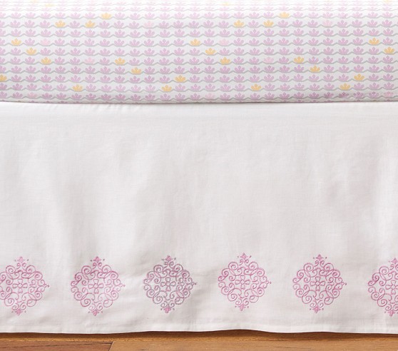 - Four-sided skirt fits around the entire crib and is tailored with split corners for easy placement around posts.