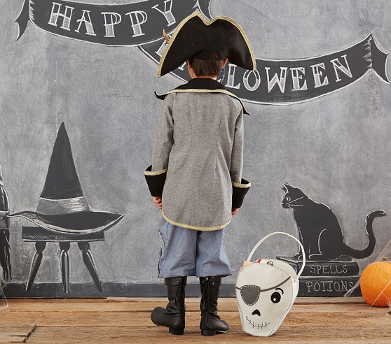 - Shirt is sleeveless; jacket features felt, and gold trim which matches trim on pirate hat.