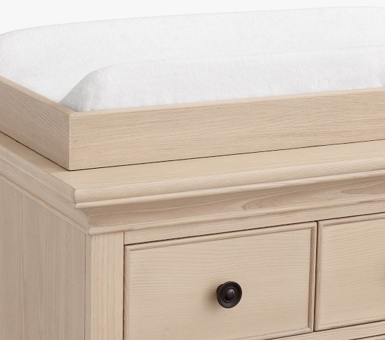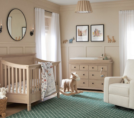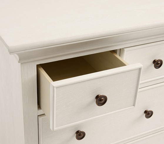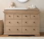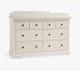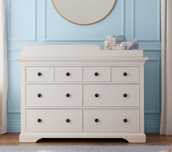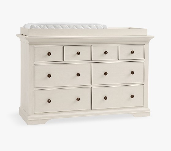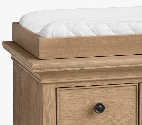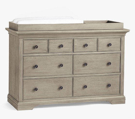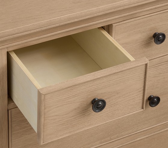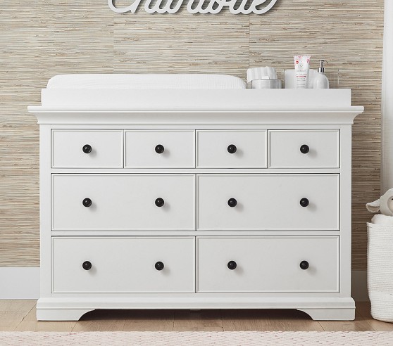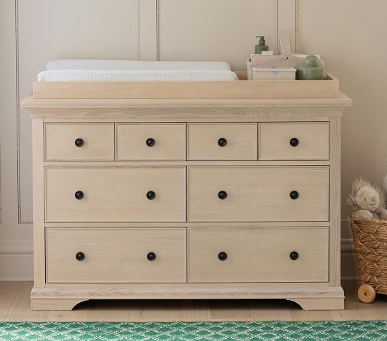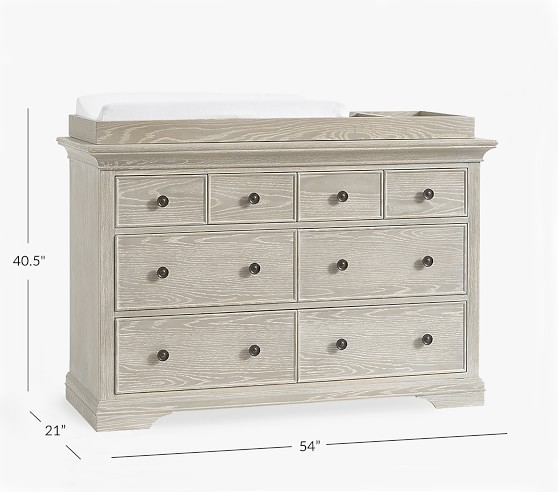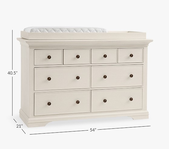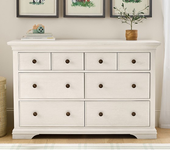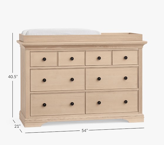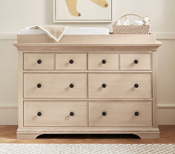 Learn MoreOur Larkin Collection features grand curves and generous proportions, combining the grace of an heirloom with the strength of new, hand-built furniture. This extra-wide dresser includes eight drawers to hold all their essentials during the nursery years, then organize their clothes, gear and toys when they grow. Plus, it works wonderfully as a nursery changing table with the included removable topper.