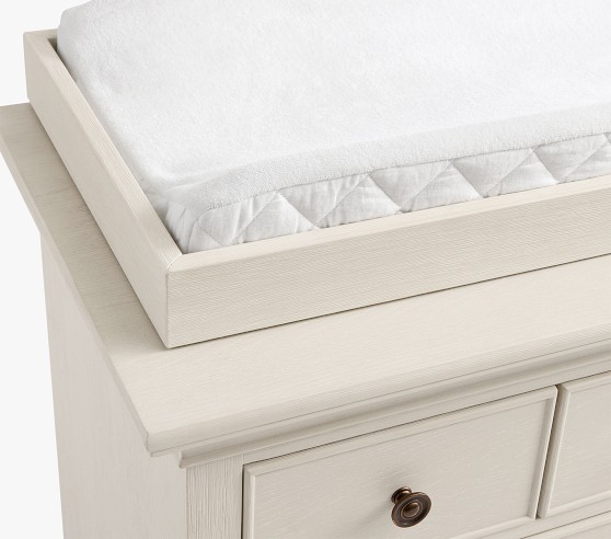 - Removable topper secures with metal brackets (included). A layer of felt on the underside protects the dresser’s surface.