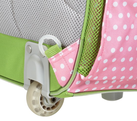 - Rolling backpack features sturdy wheels and straps that can be stored behind a fabric panel when used as a rolling backpack.