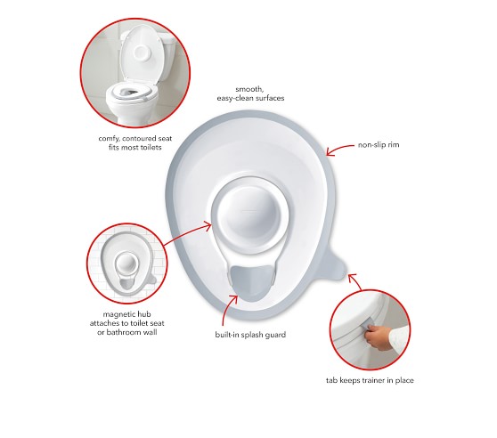 Learn MoreHelp build potty training confidence with an adaptable easy-to-use toddler toilet seat. A handy tab keeps the trainer in place and an innovative hub magnetically lifts and stores the training seat inside your toilet lid (or on the bathroom wall) so it’s out of the way when not in use.