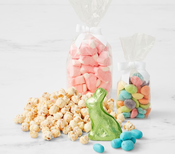 - 1 Chocolate Foiled Bunny: Solid premium milk chocolate wrapped in festive foil 2.5 oz., Sweet Sanded Eggs: Egg-shaped gummies in blue raspberry, grape, strawberry, orange, green apple and lemon flavors with a sprinkle of sweet sanding sugar 8 oz., Marshmallow Bunnies: Fluffy pink vanilla marshmallows shaped like bunnies 5.5 oz., Blue Robin Eggs: Mini-marshmallows drenched in pure milk chocolate and covered in candy shells 1.2 oz., White Chocolate Confetti Popcorn: Premium popcorn coated in white chocolate with birthday cake flavoring, and decorated with confetti sprinkles 6 oz.