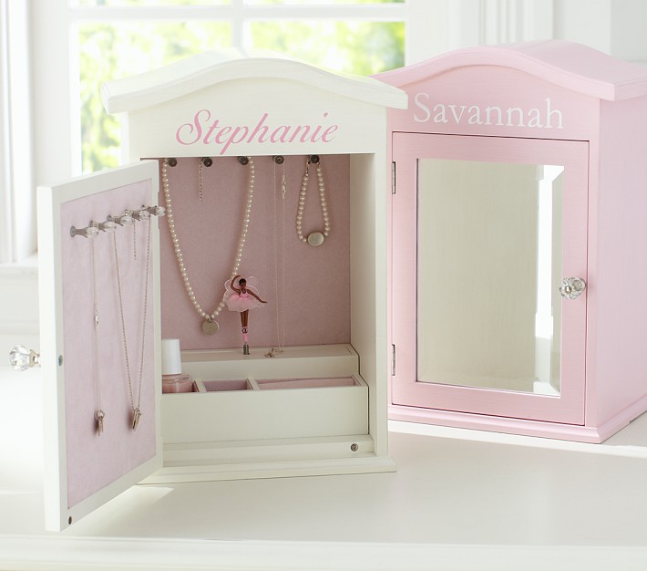 Built with the look of a stylish armoire, this delicately crafted jewelry box features a mirrored front and a dainty ballerina inside that twirls to pretty ballet music. It offers plenty of space for storage, including two rows of small pegs for displaying necklaces, pendants and more.