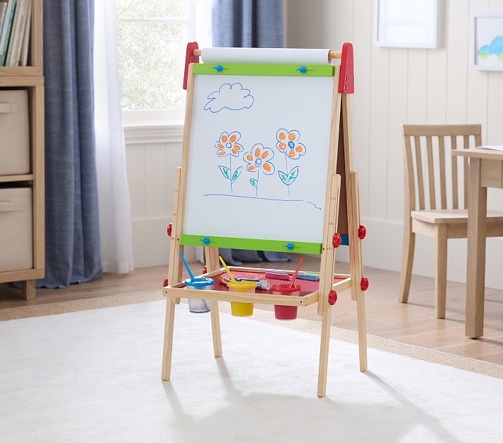 Inspire your little one's creativity with this playtime favorite. Crafted from real wood like pine and maple, this Art Easel is design to stand up to hours of artistic play. Featuring a white dry erase board, a chalkboard and a handy tray to hold all of their craft essentials, children will stay busy for hours while channeling their inner Kahlo and Picasso.