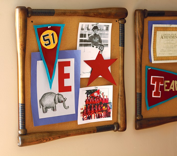 - Solid wooden bats frame an oversized corkboard.