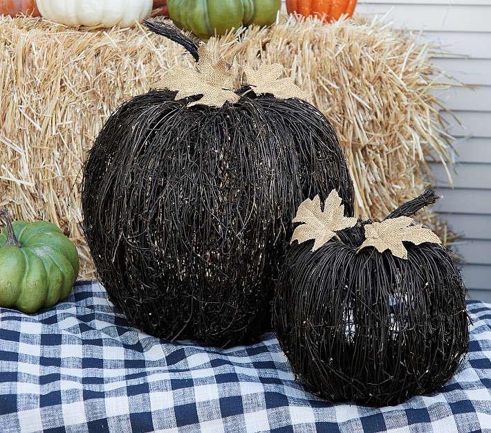 Add a hauntingly festive accent to your Halloween decor with our lighted pumpkins. Crafted of natural grapevines with a midnight-black finish, they’re brightened with warm-white LED bulbs and accented with faux leaves.