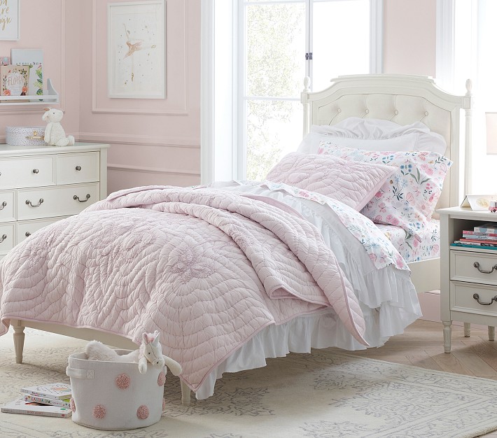 We’ve designed the favorite Blythe Tufted Bed with a low footboard so your little one can get in and out of their bed on any side. The stylish Blythe Collection features designer details and long-lasting construction. Hand-tufted, washed linen cotton upholstery and fluted posts adorn the headboard while carved rope molding, detailed finials and lathe-turned legs are other details of this beautiful bed. The Blythe Tufted Bed is GREENGUARD Gold Certified, which means it’s built to contribute to safer, cleaner air.