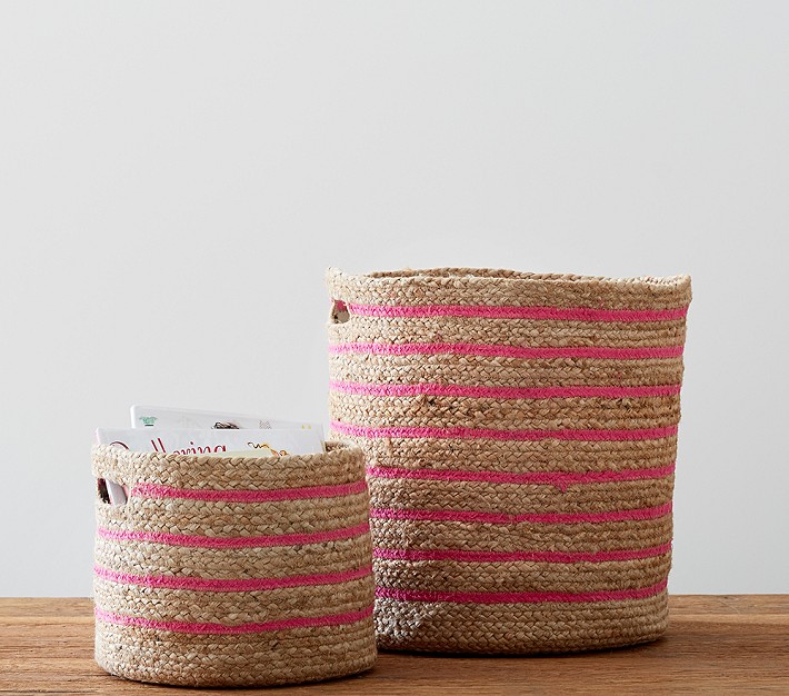 Natural jute gets a pop of striped color. Perfectly sized to hold toys, blankets and more.