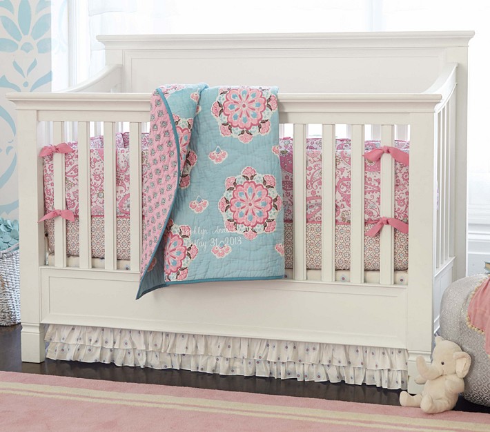 This chic nursery design is inspired by woodblock prints from India. Decorative stitching surrounds the floral motif on the handmade, whole-cloth cotton quilt. A fresh geometric design on the sheeting and pretty prints on the bumper are a perfect complement. And tiers of romantic ruffles on the crib skirt add texture and movement to the bottom of the crib.