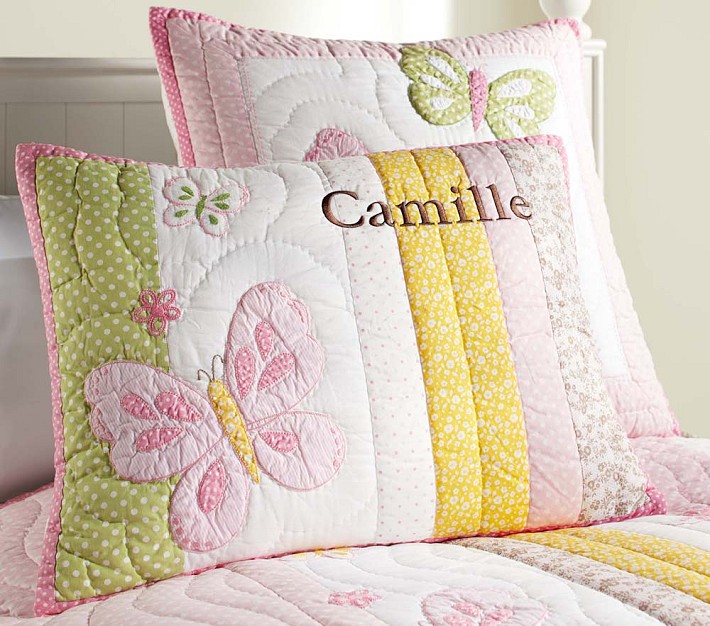 A bright, ethereal spring garden inspired this crafty collection. Handmade of soft cotton percale prints and solids, the quilt features appliqués of butterflies and flowers on a striped ground that’s accented with ripple and channel hand stitching.