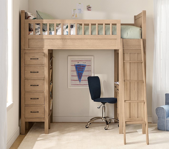 Our Camp Collection combines the charm and strength of classic plank furniture with fun style. Featuring a loft above and study space beneath, it's completed with sturdy guardrails, an easy-access ladder and built-in storage drawers. This space-saving design keeps bedtime—and their room!—beautifully organized.