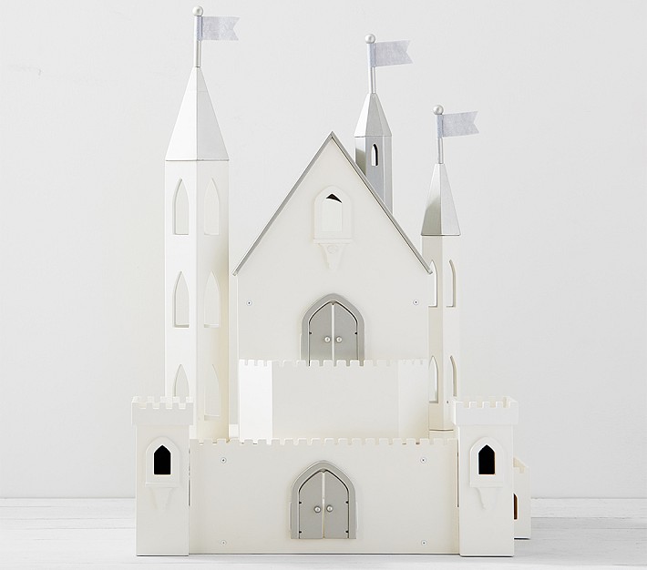 This is the fairest castle in all the land! Built entirely of wood and finished in a brilliant white, this enchanting dollhouse has three floors to accommodate royal guests and even a friendly dragon or two.