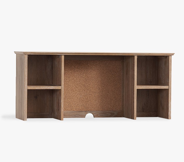 - Hutch equipped with 4 storage cubbies and 1 large corkboard and 1 cord cutout for routing wires.