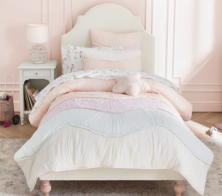 Built to last with a stylish headboard and turned wood feet, our Chloe Bed is an elegant addition to their sleep space. The upholstered frame features artful curves and offers a soft spot for your little one to lean while reading. Plus, it's UL GREENGUARD Gold Certified, meaning it contributes to healthier indoor air.