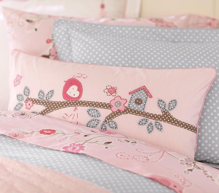 A single songbird perches outside his house atop a branch decorated with leaves and flowers. These sweet appliqués are designed in a mix of polka-dot, yarn-dyed and solid fabrics.