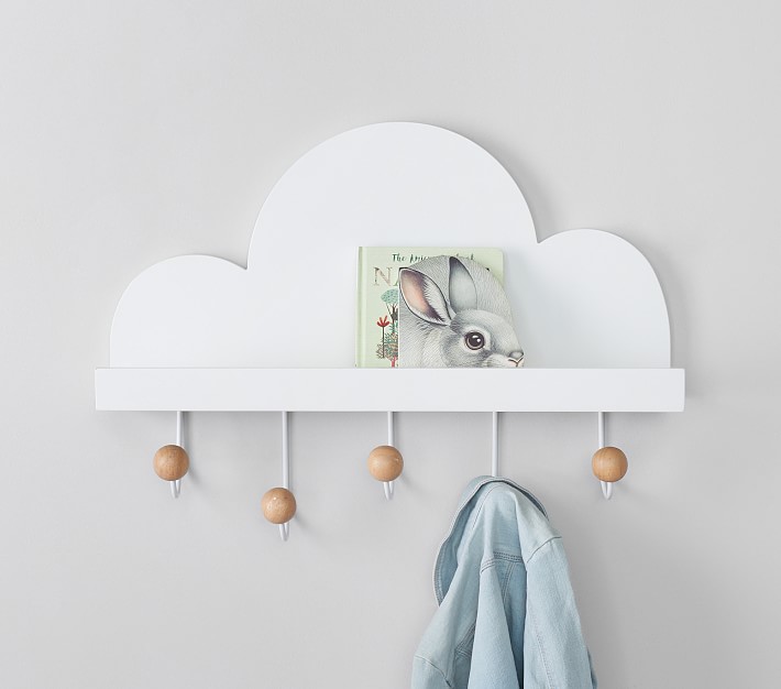 Add sweet, simple storage to their nursery, bedroom or play space with our Cloud Shelf. With five hooks under the shelf, there's enough room to hang their go-to sweaters or favorite dress-up outfits.