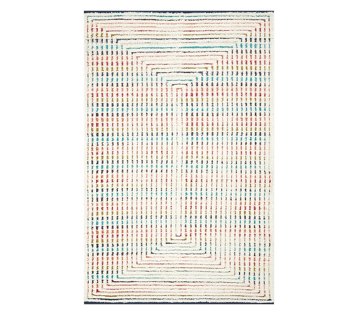 We colored inside the lines to create this rug’s fun optic pattern, which alternates rainbow colors with concentric white rectangles. Hand loomed from wool and cotton, the supersoft pile is perfect for crawling, walking and playing.