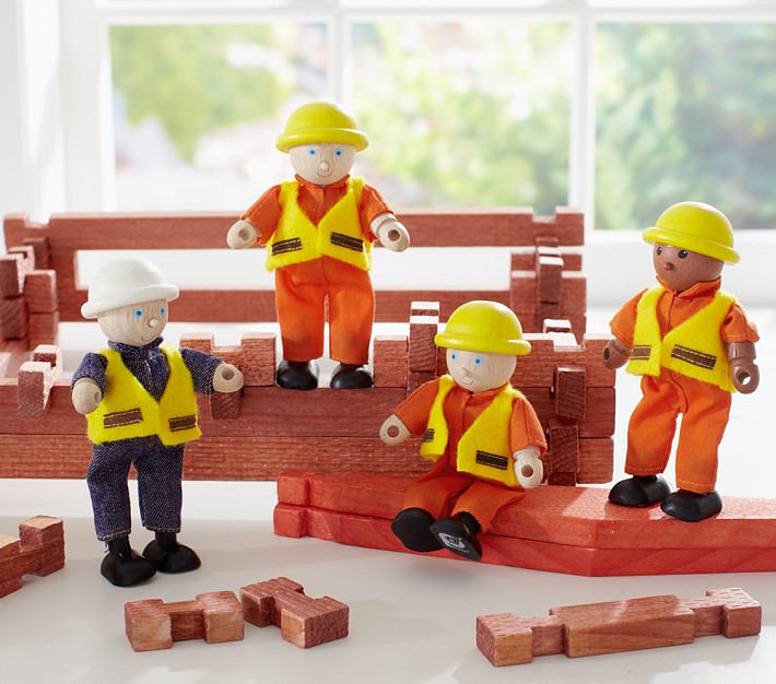 This set of four workers, including a foreman, brings our construction toys to life. The top-quality figures are crafted of wood with detailed fabric work suits, colorful hard hats and bright yellow safety vests.