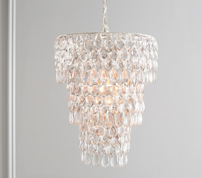 - Crafted of iron with clear acrylic drops and hand finished in Simply White.