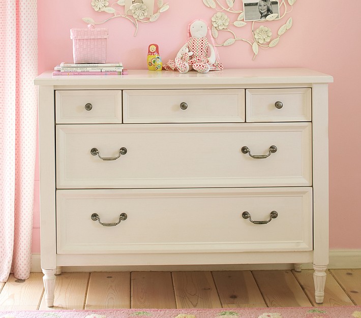 - Dresser is equipped with two small, one medium and two large drawers, and easily converts to a changing table with the addition of our Changing Topper (sold separately).