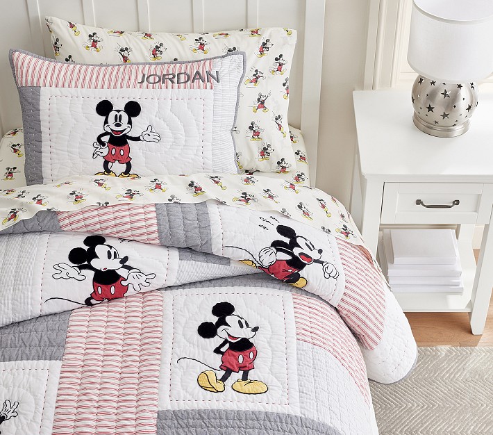 Inspire the happiest dreams on Earth with our patchwork cotton quilt. Vibrant, vintage illustrations of Disney’s Mickey Mouse are pieced with soft chambrays and yarn-dyed stripes, then quilted over pure-cotton fill for naturally cozy comfort.
