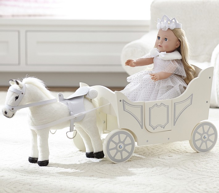 Her favorite doll deserves a royal ride. Beautifully crafted with graceful details, this horse and carriage are ready for hours of imaginative storytelling of castles and drawbridges from long ago.