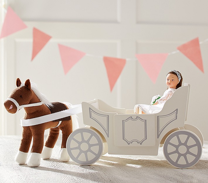 - Carriage features opening doors, wheels, and string to pull carriage.