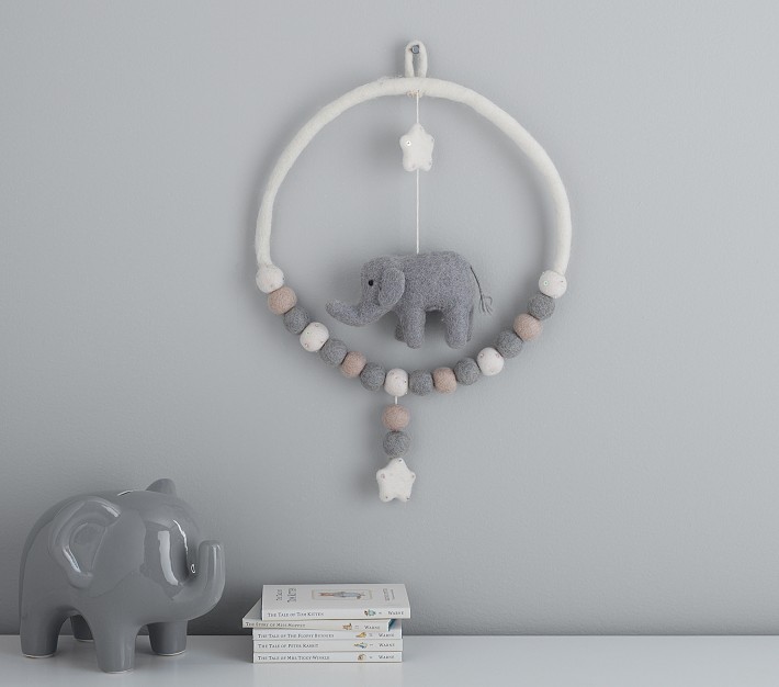 Provide a warm welcome to the nursery with our Felted Wool Elephant Wreath. Made for hanging on a door or wall, this work of art is entirely handmade, from the circular frame to the tip of the elephant's tail.