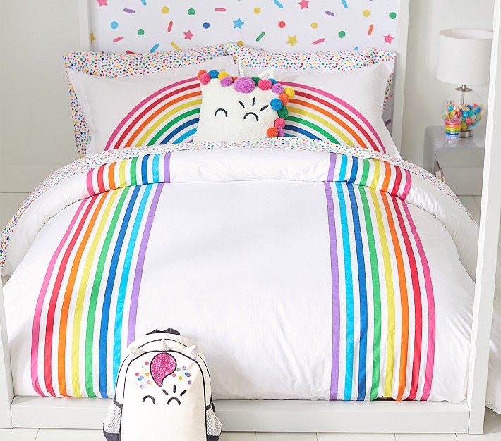 - Matching shams complete a rainbow design with duvet cover. Twin completes rainbow with 1 sham.