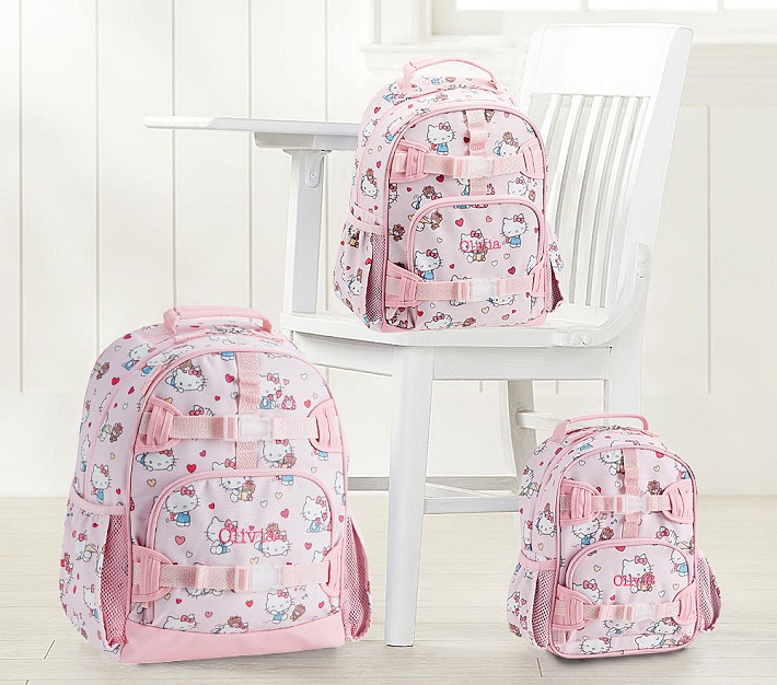 Decorated with Hello Kitty, her teddy bear Tiny Chum and hearts galore, our backpacks are sturdy, ultra-functional and super-lovable. Pockets, straps and gear loops keep everything in place, while water-resistant polyester boosts durability. Equipped with adjustable padded shoulder straps, exterior straps to hold a Mackenzie lunch box and exterior side pockets fitted to our water bottles, it's the most efficient and playfully designed collection around. Personalize it with their name or initials for an extra-special touch.