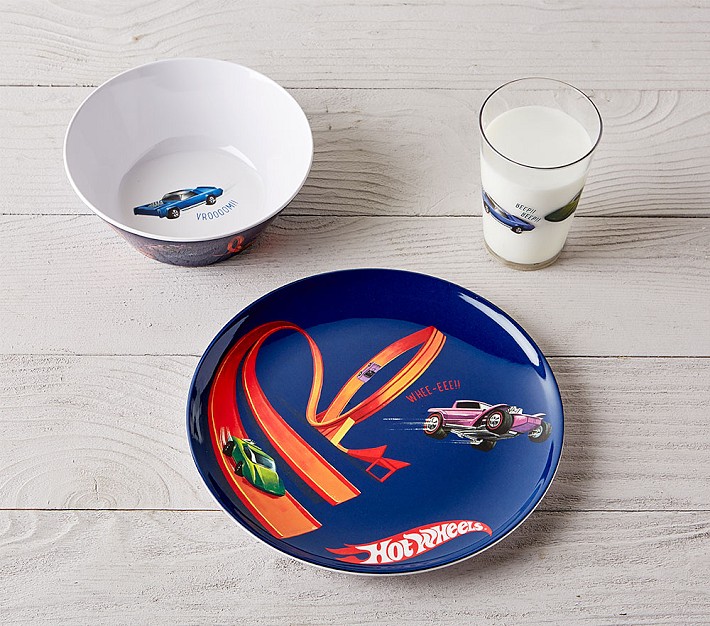 Vroom, vroom! This BPA- and lead-free tabletop set includes a shatterproof plate, bowl and tumbler designed with their favorite racetrack-ready cars.