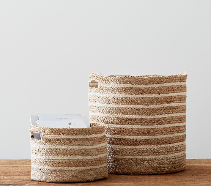 Natural jute gets a pop of striped color. Perfectly sized to hold toys, blankets and more.