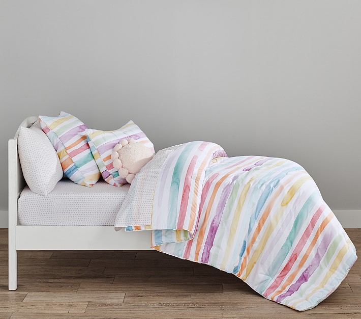 Our Kayla Stripe Bedding Look brightens their world with rainbow colors in charming paintbrush prints. We added a pom-pom pillow for whimsical detail with cuddly softness.