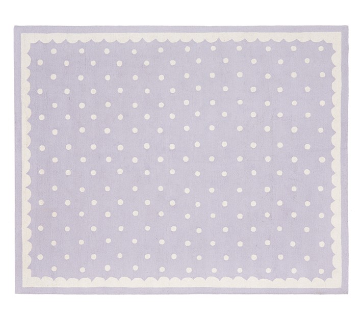 Sprinkled with polka dots and surrounded by a simple scalloped border, this rug is a great addition to a child’s bedroom or play area.