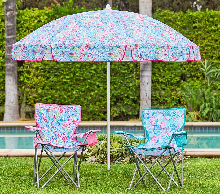 Here's to the whole family relaxing and enjoying a day of fun in the sun! Our beach umbrella is adorned with a vibrant mermaid print on its recycled, UV-protected fabric, making it both fashionable and functional. Imagined exclusively for Pottery Barn Kids by Lilly Pulitzer, the iconic brand that started with a juice stand and a shift dress in Palm Beach and has been making people smile ever since with its vibrant hand-painted prints.