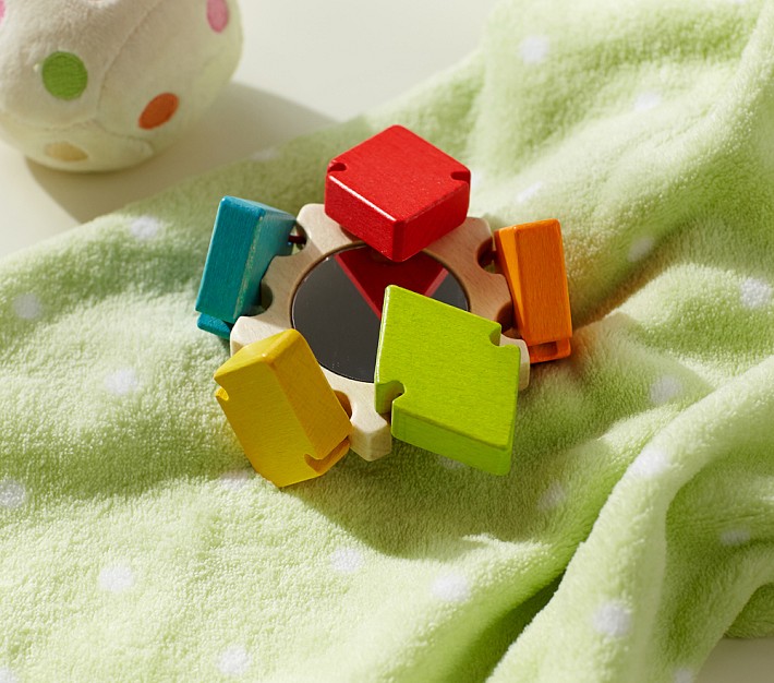 This petite mirror is perfect for tactile play with its brightly colored and sustainably harvested wood back.