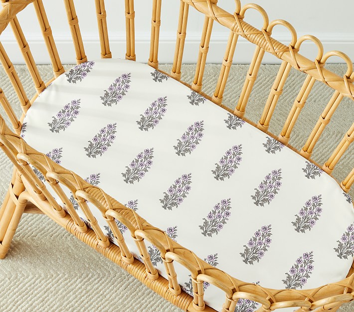Create a soothing sleep space with our organic cotton fitted sheet, perfectly sized for their bassinet. Printed with floral medallions in pastel purple, it lends a touch of color along with natural softness and breathability.