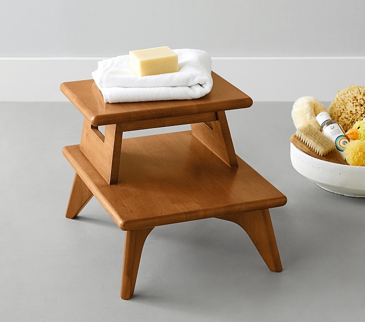 Give them a leg up with the Mid-Century Step Stool. Inspired by American modern design and crafted of sturdy solid wood, the two-tiered design borrows its angled lines and stable, beveled legs from iconic '50s and '60s furniture silhouettes. Designed in collaboration with West Elm.
