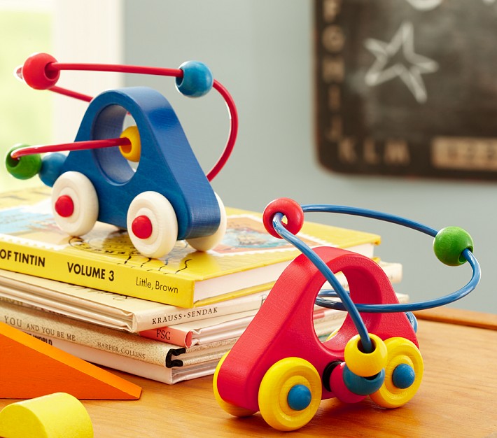 Motion and balance make these cars fun for little motorists. Colorful wooden beads glide along looping steel wires, and the wooden cars can roll back and forth.