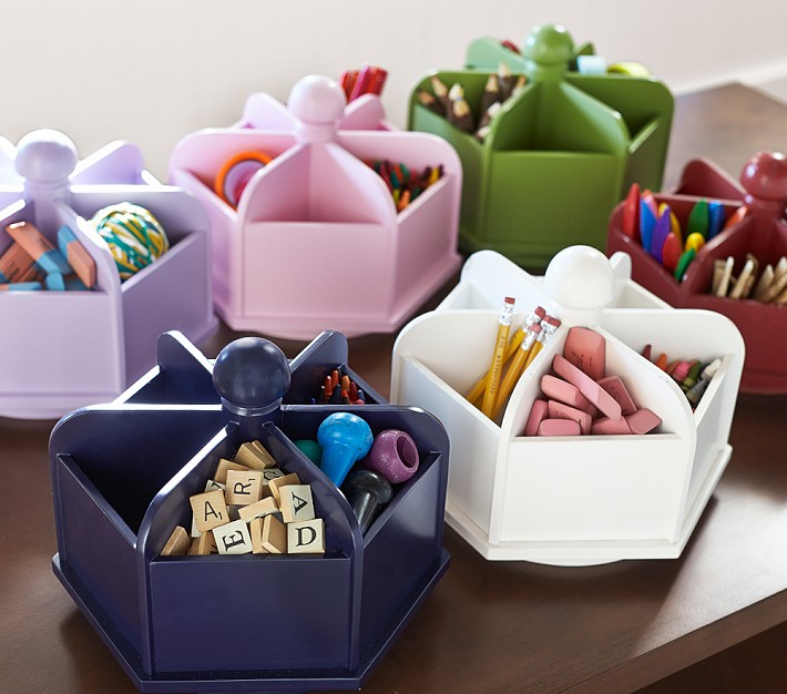 This pint-sized organizer keeps small supplies within easy reach. Perfect for filling with pens, pencils, crayons and more, six compartments with high side walls for improved storage spin atop a wooden base.