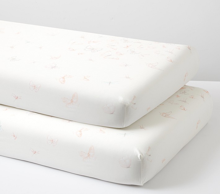 Let these oh-so-delicate butterflies grace the nursery with their calming charm. Sewn of luxe sateen, our Ethereal Butterfly Crib Fitted Sheet Bundle features soft blush and cream hues. Imagined with world-renowned fashion designer Monique Lhuillier, it brings her contemporary, whimsical and magical design aesthetic to your little one's space.