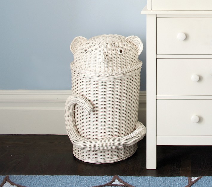 This supercute monkey invites kids to have fun putting their laundry and toys away. His tail curls playfully around the front of this versatile hamper, which is tightly woven of sustainable rattan.