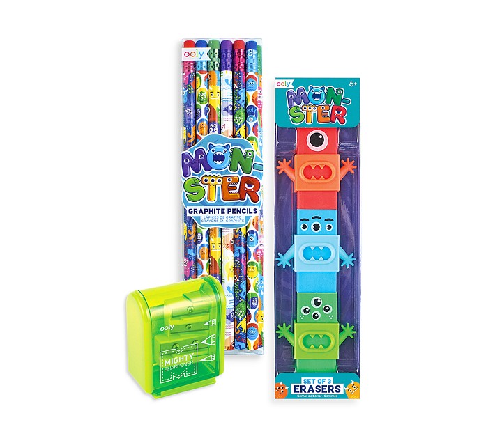 - The set comes with 3 monster erasers, 12 monster #2 graphite pencils and a mighty sharpener.