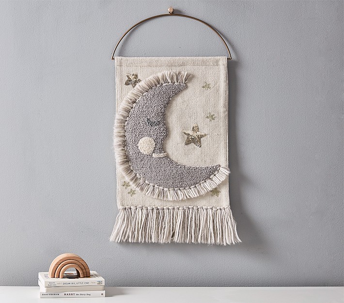 We’re over the moon about our handwoven tapestry! Featuring a beautiful crescent moon design, it’s handmade of wool, cotton and sequins, adding a touch of luxe to their bedroom or playroom.