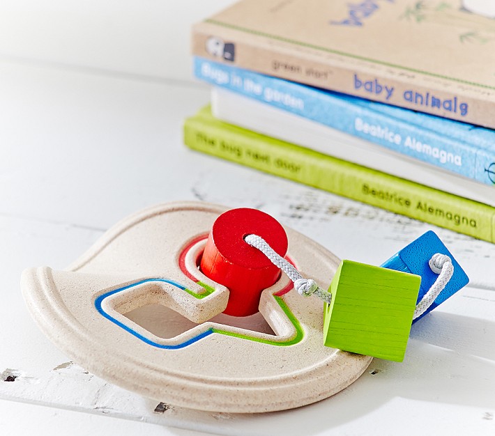 Perfect for travel because it has no loose pieces, this wooden shape shorter gets your baby thinking and exploring through play.