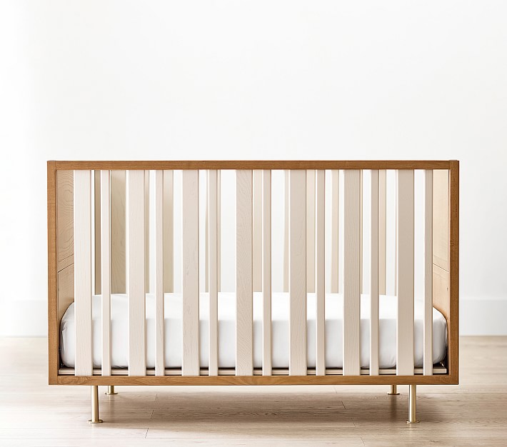 This stylish two-toned Novella 3-in-1 Convertible Crib from Nursery Works is designed to be a lasting furniture piece from their baby years well into elementary school. It’s a timeless, modern crib that converts into a daybed then into a reading nook as they grow. Featuring a solid ash frame with bridle joinery and solid brass-plated legs, this crib is durable and will last for years to come.