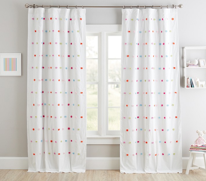 Confetti-colored pom-poms decorate this panel and lend a sweetly playful accent to your nursery. Unlike most blackout panels, this one is entirely sewn of fabric to keep light out and warmth in.