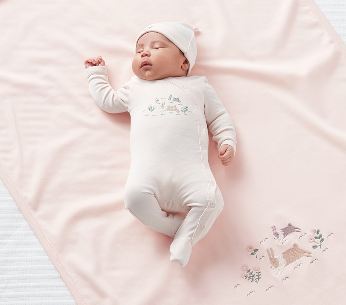 Give the warmest, cutest welcome with this baby-ready bundle. Our Welcome Home gift set includes a coordinating blanket, one-piece pajama and beanie hat that are crafted of 100% pima cotton. This set is embroidered with sweet bunny and floral illustrations that look like they hopped right off the pages of a storybook.