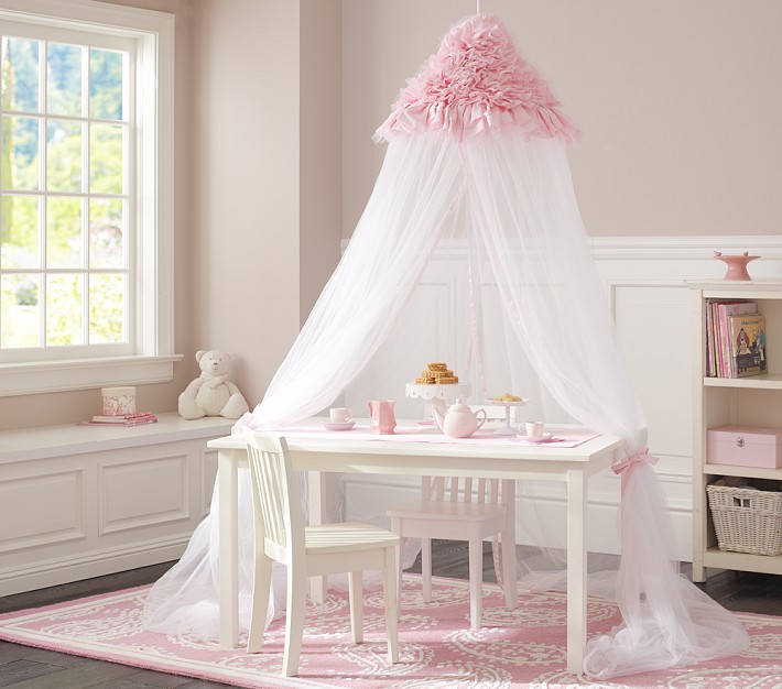 Create a magical spot for dreaming and playing with this ethereal tulle canopy. A pink cotton flower up top and sweet ribbon details add charm and whimsy.